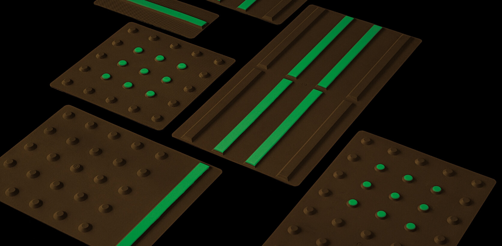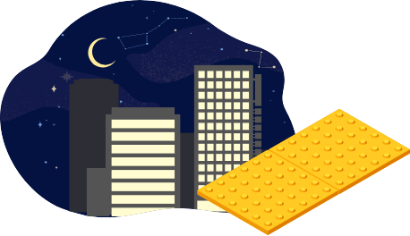 蓄光材料は昼間に太陽から紫外線を蓄積し暗くなると光って⾒える特性を持つ材料です。⽇没後暗くなった屋外で、突起部分が光ることにより点字タイルが⽬⽴ち、夜間歩⾏の安全を確保します。