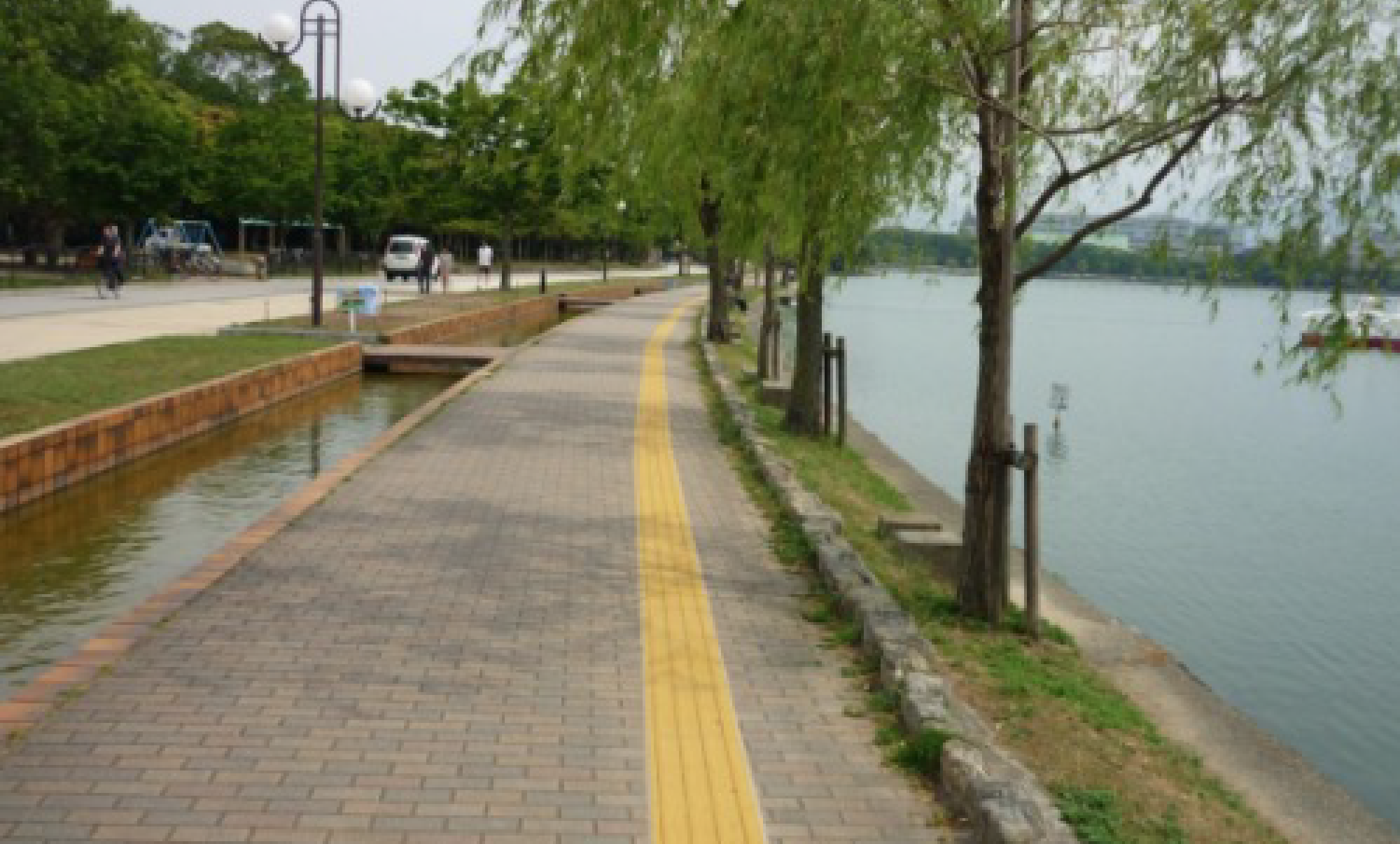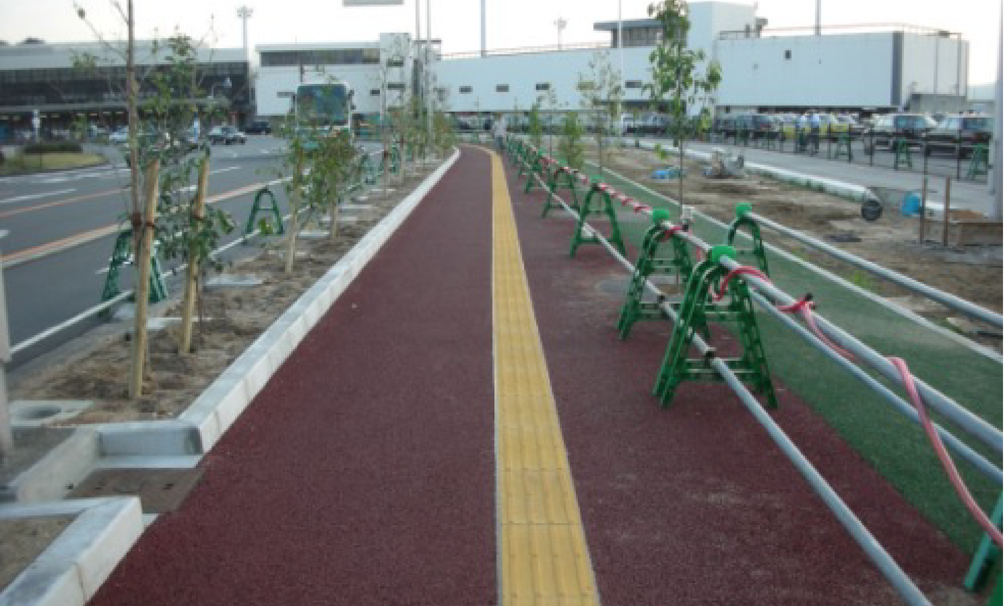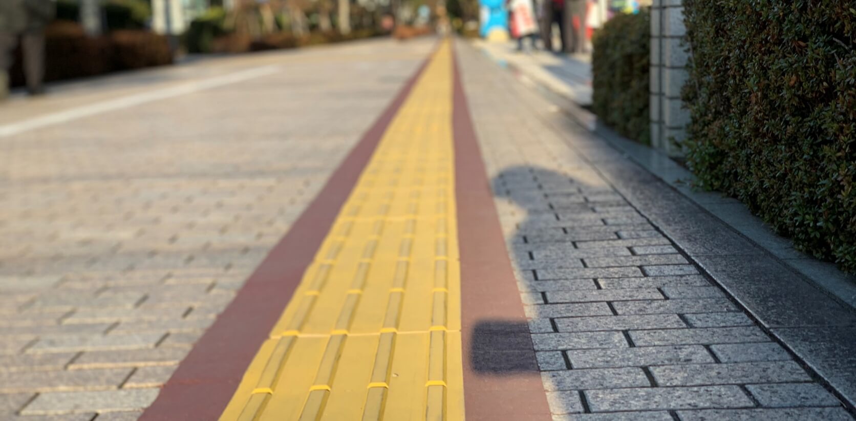 Mブレイルの両サイド舗装上に塗布する、⾊付き樹脂となります。明るい路⾯舗装上でもサイドカラーを設置することで、輝度⽐を向上させ、視覚障害者の⽅が舗装と点字ブロックを⾒分けやすくなり、安⼼して歩⾏ができるようになります。