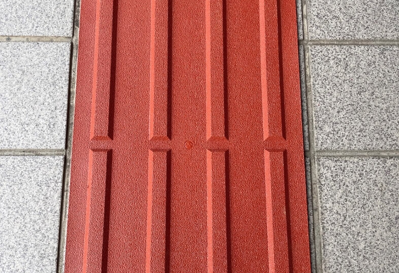 点字タイルは、よく皆様が⽇常で⾒られる⻩⾊以外の⾊も製作可能です。写真のような⾚茶⾊も可能ですので、お困りの際は営業担当者へお問合せください。
