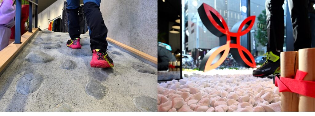 シューズの履き心地を確認する試し履きコースや店内装飾の一部に天然の石や軽石を使用し、自然の恵みを感じる空間に。
