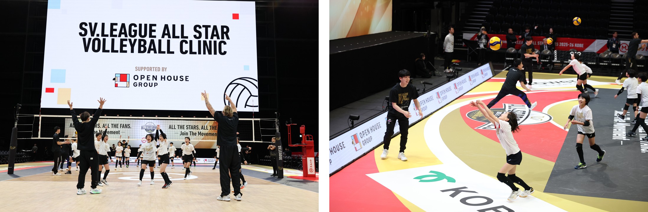 また、各試合当日の午前中には、オールスターゲームの出場選手の方々が講師となり、地元神戸市の小学生を対象としたバレーボール教室が開催されました。子どもたちは、トップレベルの選手から試合と同じ舞台で直接指導を受け、貴重な時間を過ごしました。