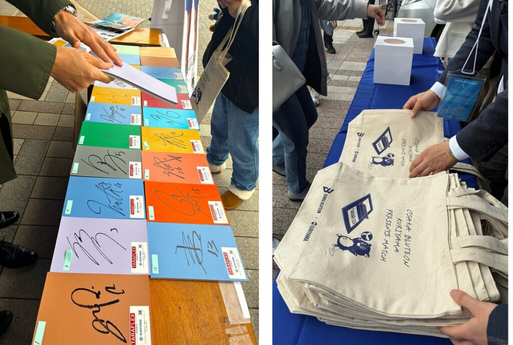 また、当日はクリヤマ出展ブースを設け、今回の試合のフロアでも使用された屋内スポーツ用長尺塩ビシート「タラフレックス」のサンプル展示や、山内選手、西田選手等身大パネルの撮影スペースなどを設置しました。さらに、来場者プレゼント企画として、タラフレックスに選手18名それぞれのサインが入った「サイン入り特典」が当たる抽選会を実施しました。 抽選にはずれてしまった方にも大阪ブルテオンと当社がコラボしたオリジナルトートバッグをプレゼントし、多くの方々に足をお運びいただきました。